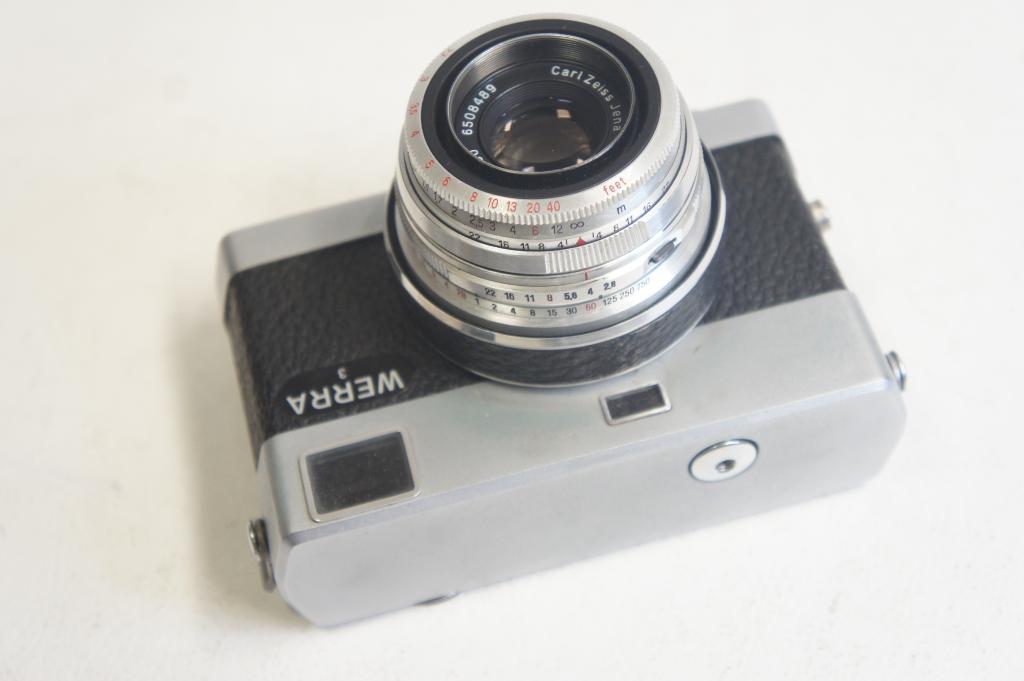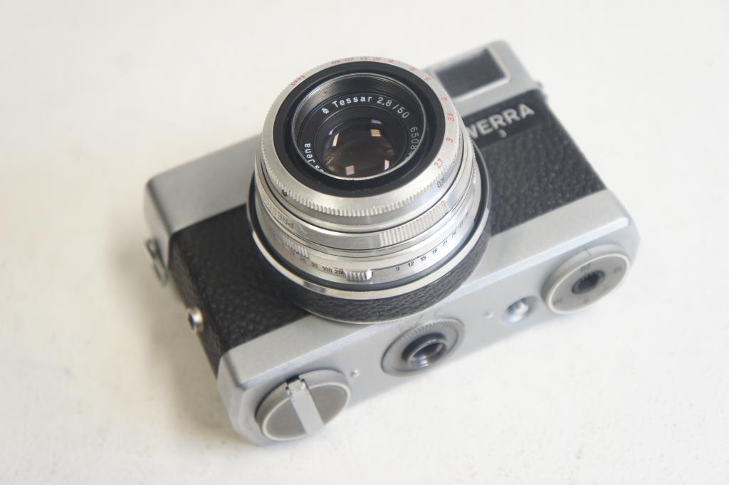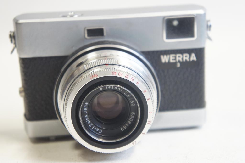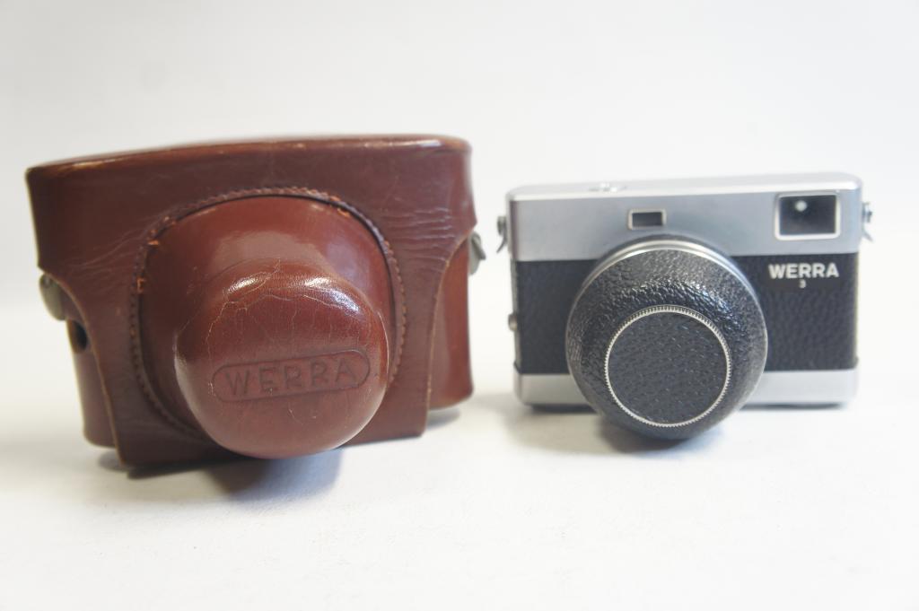 Werra 3 fényképezőgép sz.: 577806, Tessar 2,8/50mm objektív sz.: 6508489 Tokkal (objektív tartónál hibás)