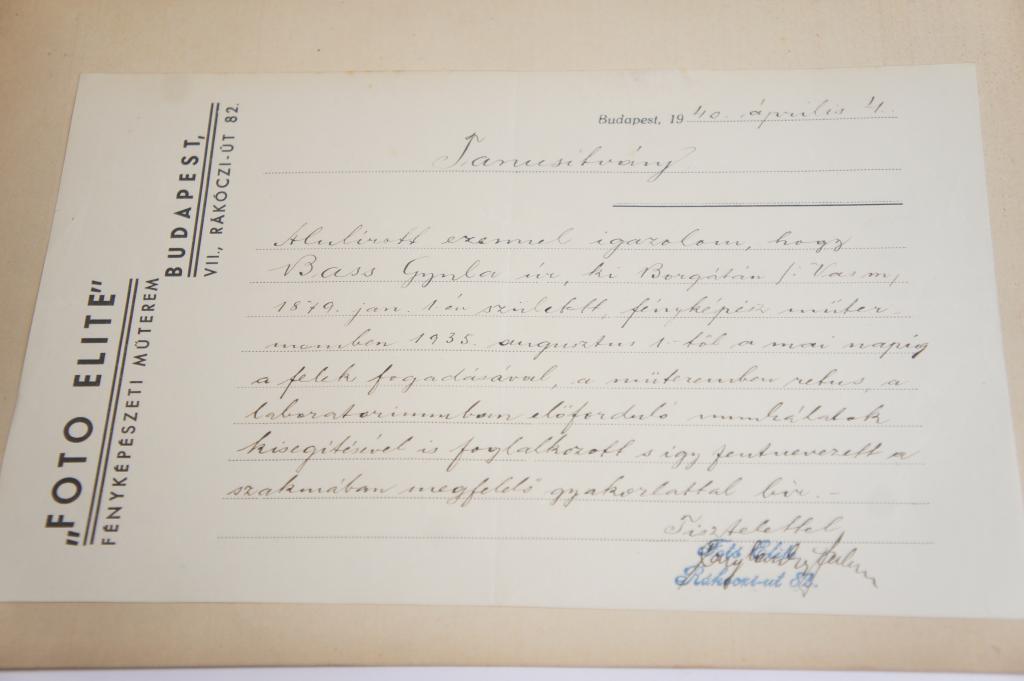 1940-ben kiadott tanusítvány Bass Gyula fényképész alkalmazásáról Jó állapotban.