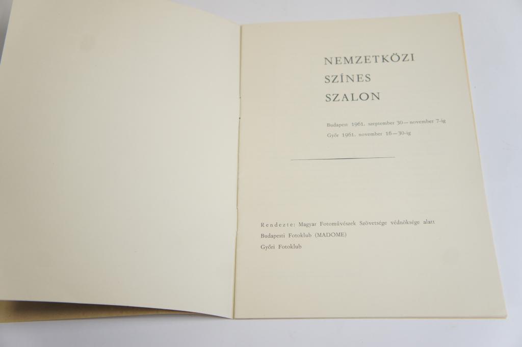 Nemzetközi Színes Fényképkiállítás és diabemutató katalógusa 1961 Budapest-Győr Kb.: A6/5 méret, 20 oldal jó állapotban.