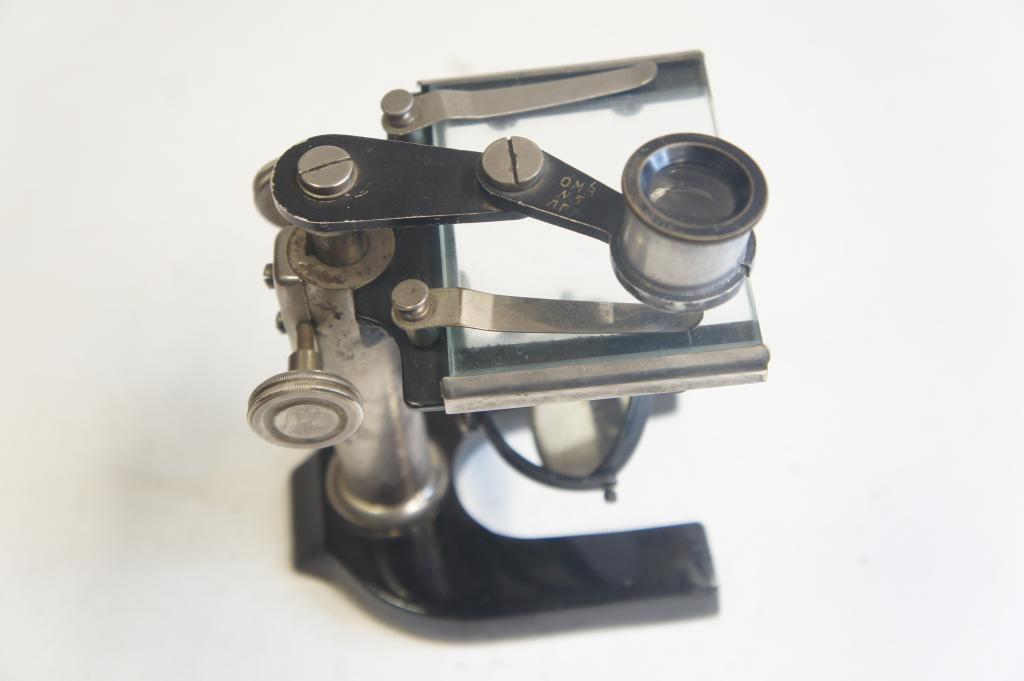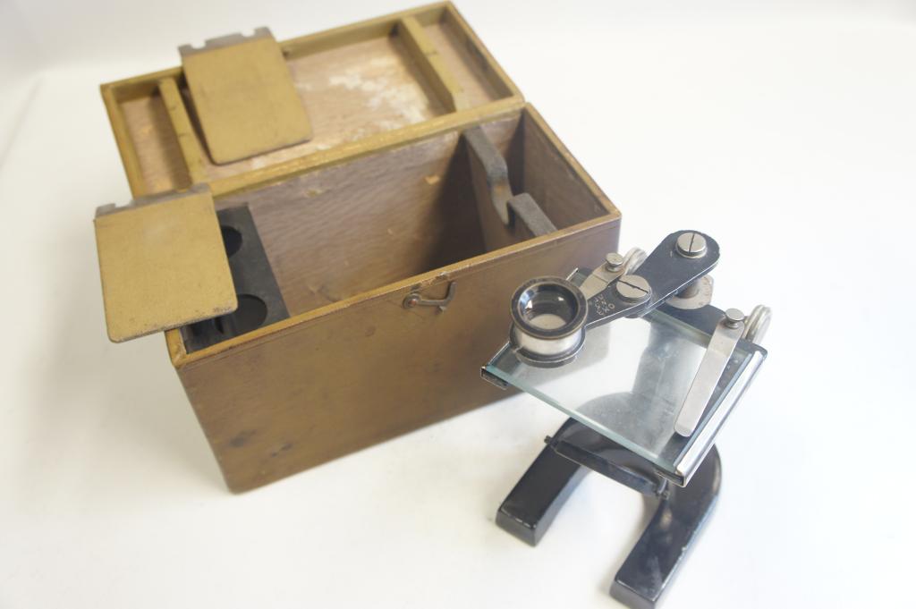 OM3 N5 Szovjet gyártmányú mikroszkóp Dobozzal. Tisztításra szorul. Tükör foltos.